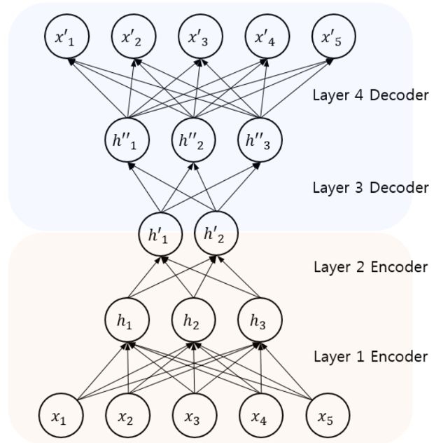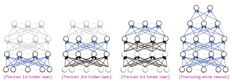 기존의 Autoencoder와 비슷해보이지만 차이점은 아래 그림과 같이 Stacked Autoencoder의 경우 Greedy Layer-wise Training을 하게 됩니다. 즉, Fine Tunning 식으로만 Back propagation을 하고 다른 경우 2개의 layer만 있는 경우 즉, Bipartite graph를 활용한 RBM으로 학습을 진행하게 됩니다.